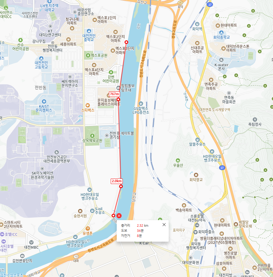 거리: 약 5~6km (일부 우회 필요) 분위기: 연구단지 러닝족이 자주 찾는 코스 특징: 평지 위주, 쾌적한 도로 연구단지 분위기와 벚꽃길이 어우러짐. 좀 짧은 감이 있다면 도룡동 엑스포다리까지 뛰는것도 추천!